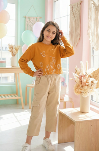 ست بلوز کراپ با طرح گل لاله و پروانه رنگ خردلی و شلوار کتان کرم چهار جیب دخترانه