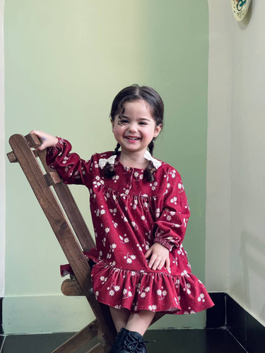 پیراهن گلدار قرمز دخترانه با گلدوزی دور یقه