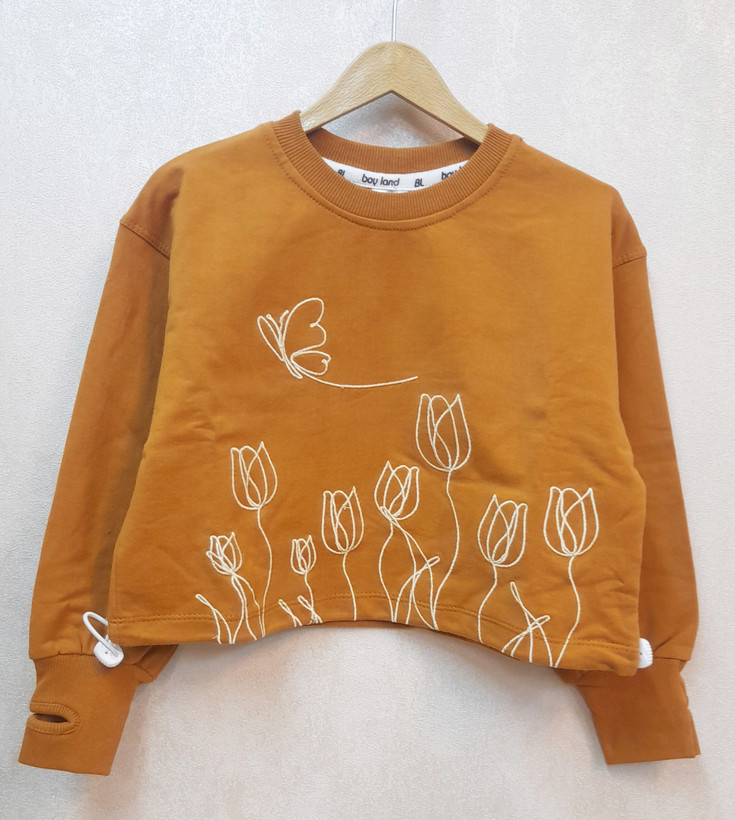 بلوز کراپ با طرح گل لاله و پروانه رنگ خردلی