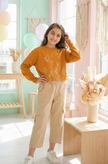 ست بلوز کراپ با طرح گل لاله و پروانه رنگ خردلی و شلوار کتان کرم چهار جیب دخترانه