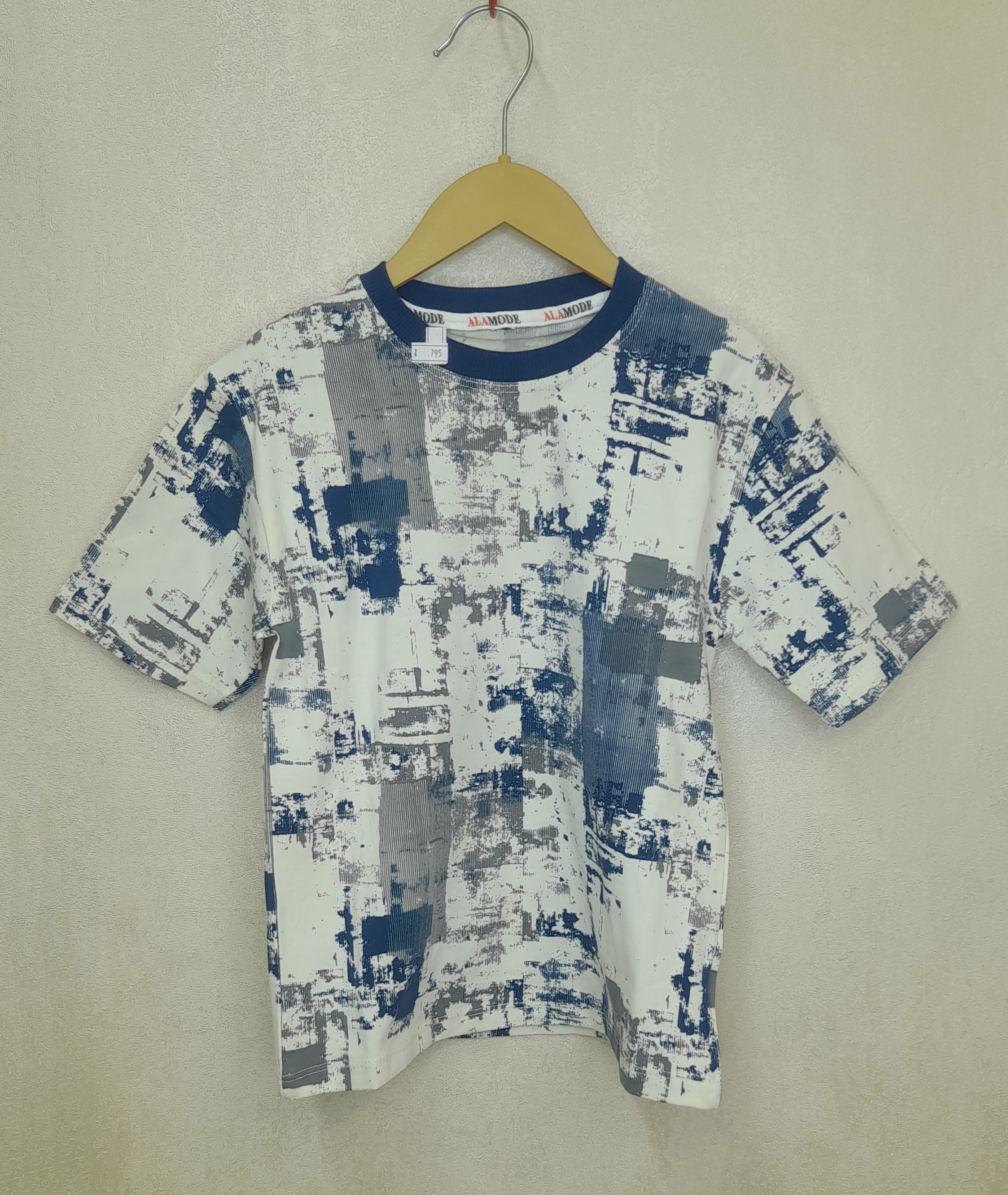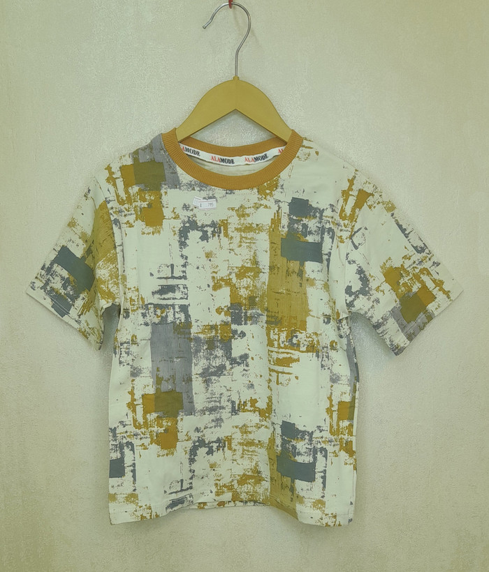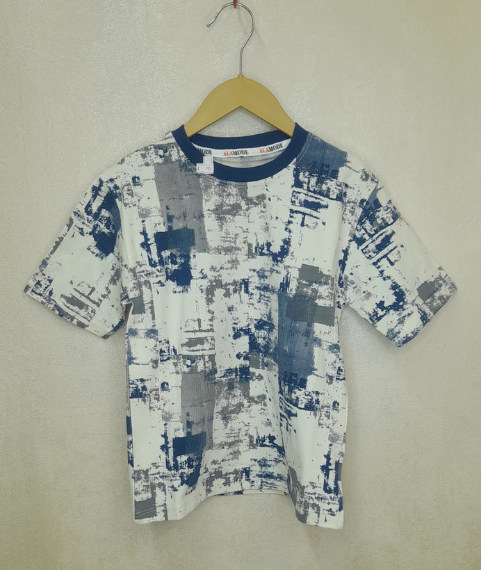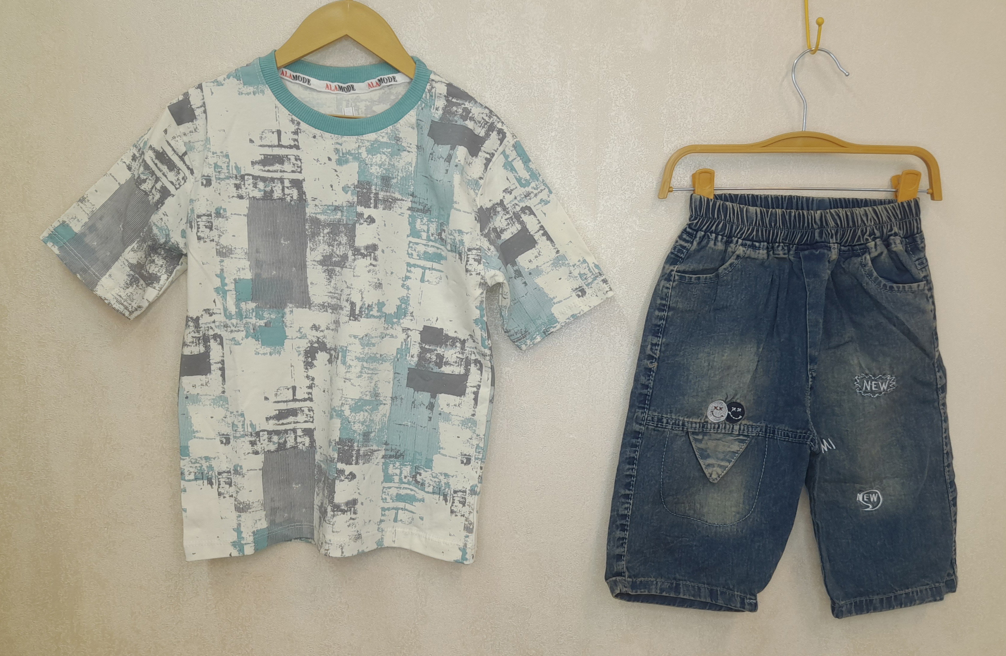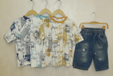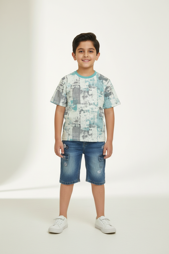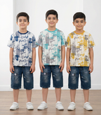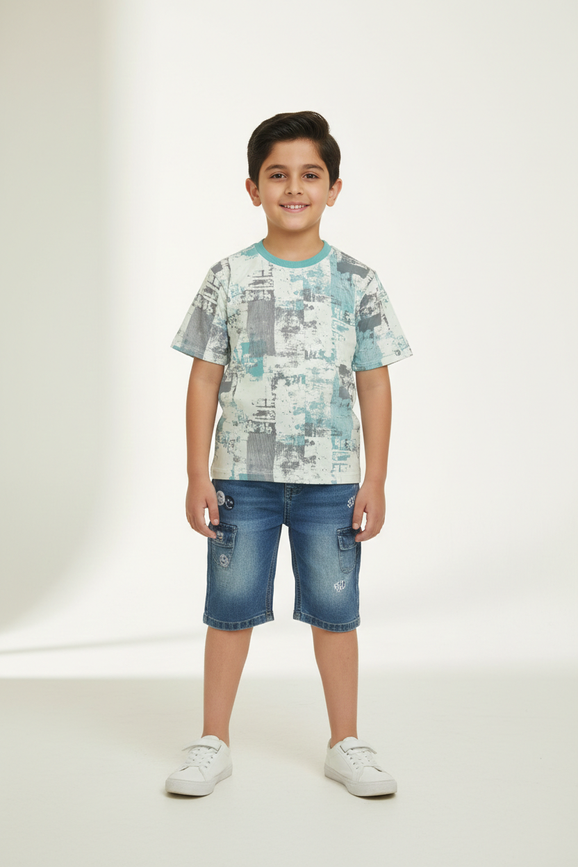 ست بلوز طرح دار کامپیوتری و شلوارک جین پسرانه