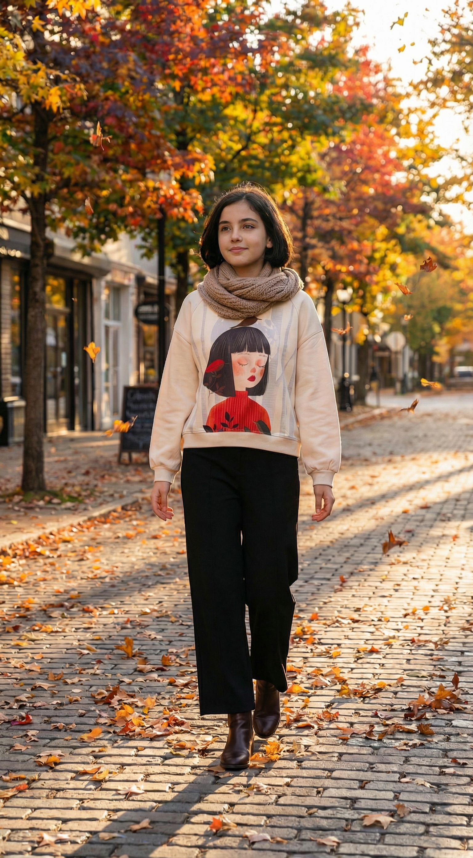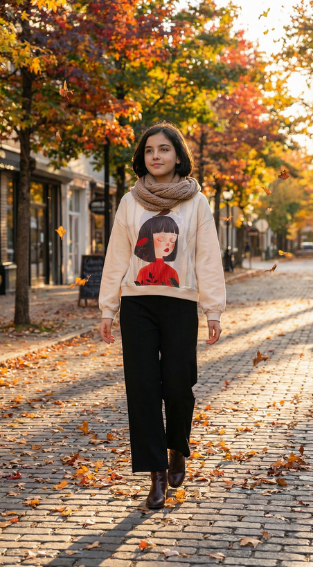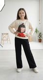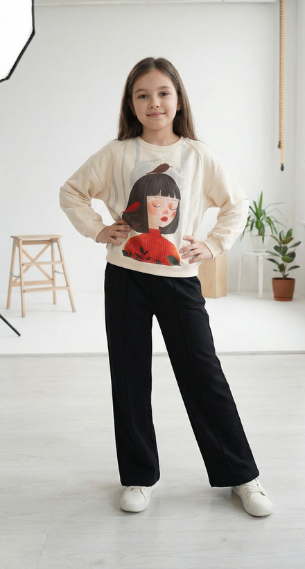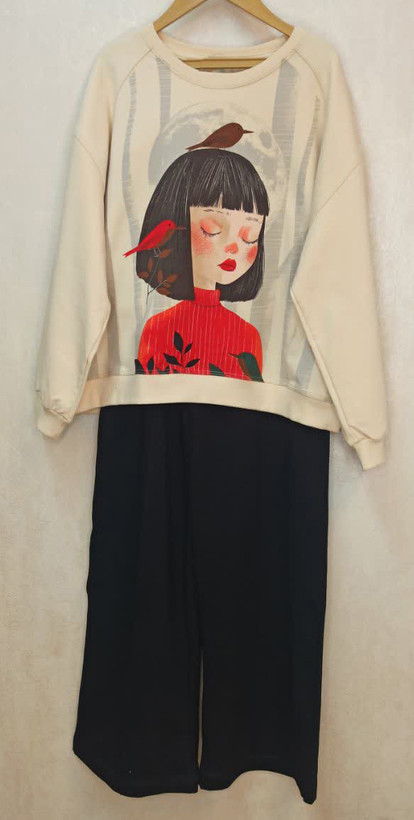 بلوز دورس لش کیفیت عالی با طرح دختر و گنجشک و شلوار بگ مشکی