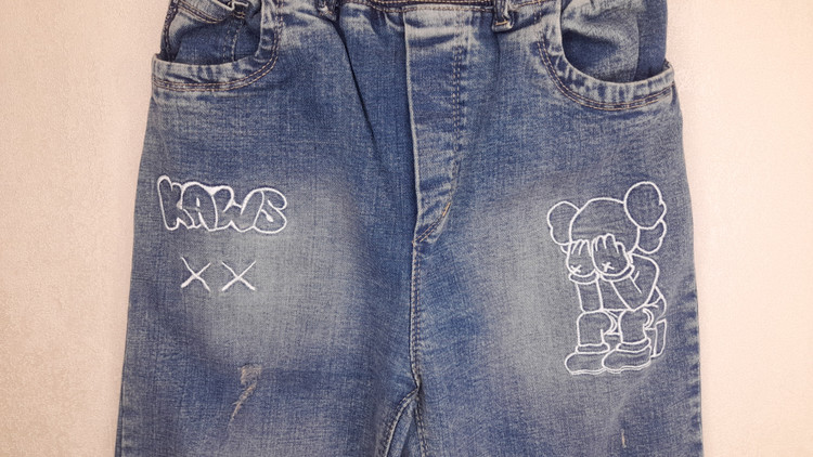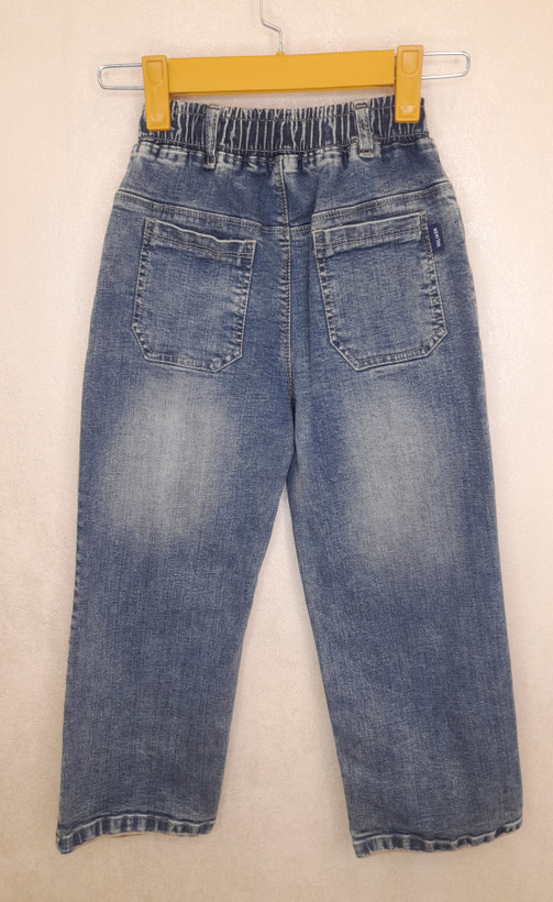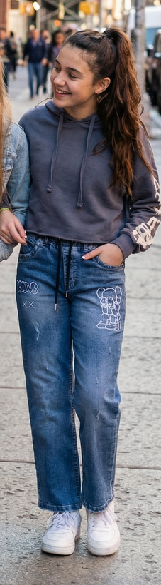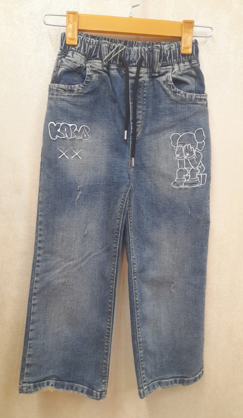 شلوار جین آبی نیم بگ دخترانه با گلدوزی سفید دختر و نوشته